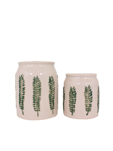 Kruka stengods. Creme krackelerad, grönt bladmönster. Öppning 10cm, höjd 14cm